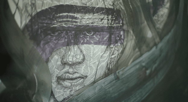 Alp İşmen “Biri/Someone” adlı tuvalde, arkasına gizlendiğimiz alt benlikler ve bu sayede büründüğümüz kimliklere, söylediğimiz yalanlara ve yaşanmamışlıklara değiniyor.