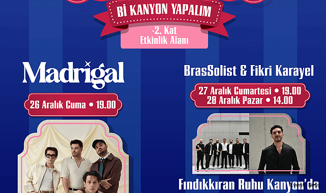 Program, 26 Aralık Cuma akşamı Kanyon -2. kattaki Etkinlik Alanı’nda gerçekleştirilecek geleneksel Büyük Yılbaşı Konseri ile başlayacak. Bu yıl konserin konuğu, modern sound’u ve enerjik sahne performanslarıyla tanınan Madrigal olacak. Grup, saat 19.00’da sahne alarak yeni yıl atmosferini müzikle karşılayacak.